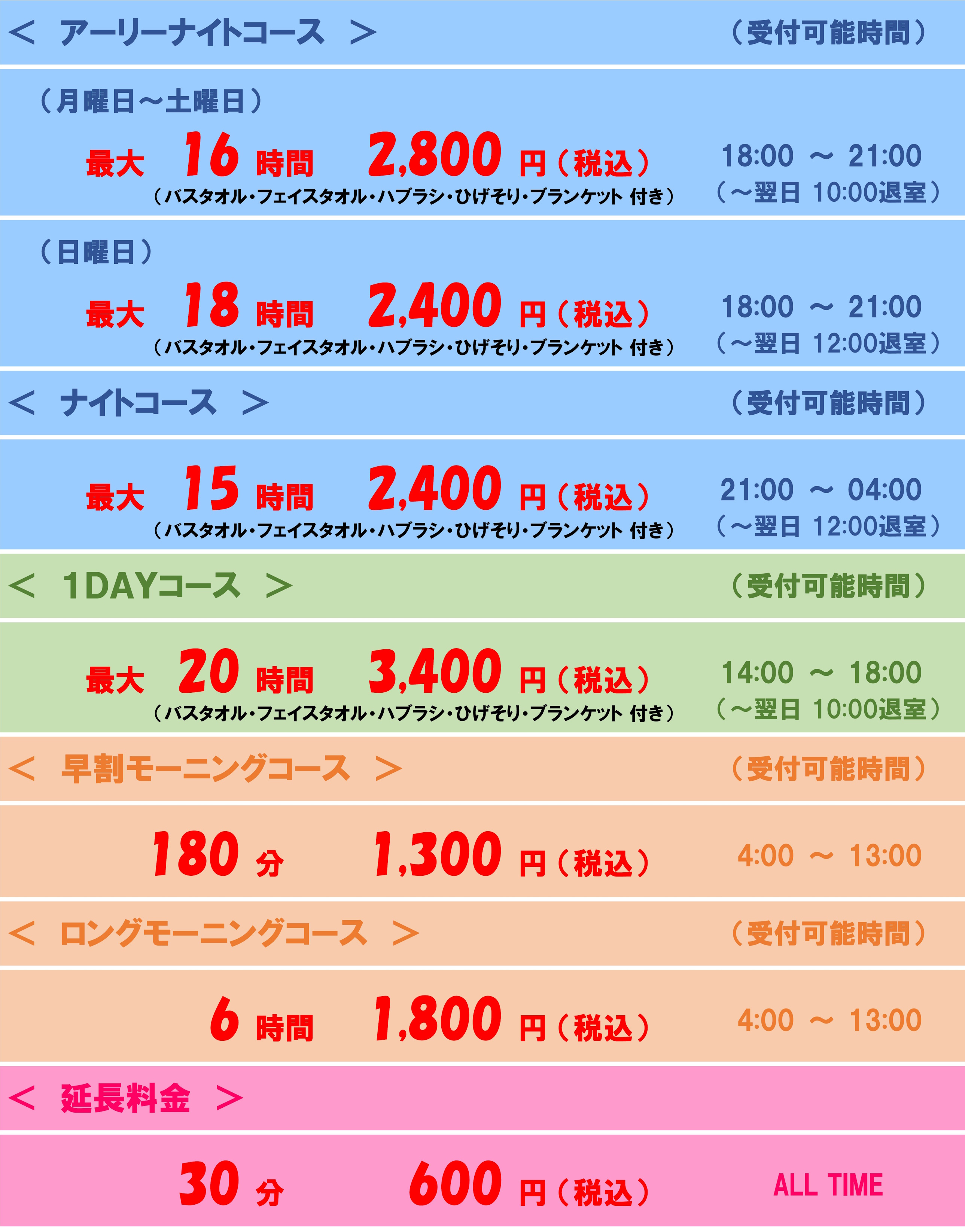期間が長ければ長いほど1日あたりのご利用料金が割安になります。各コース、お部屋数に限りがありますのでご希望のお客様はフロントにお問い合わせください。
